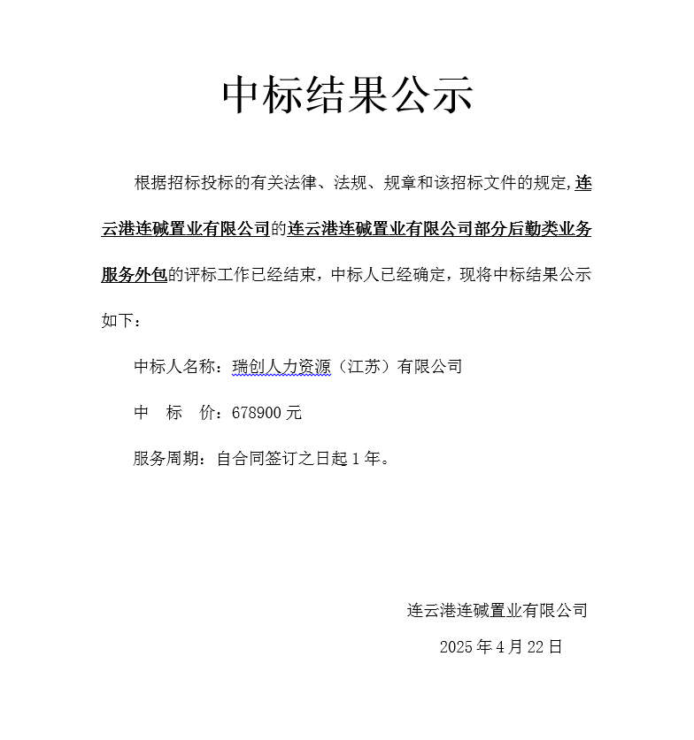 連云港連堿置業(yè)有限公司部分后勤類(lèi)業(yè)務(wù)服務(wù)外包中標(biāo)結(jié)果公示