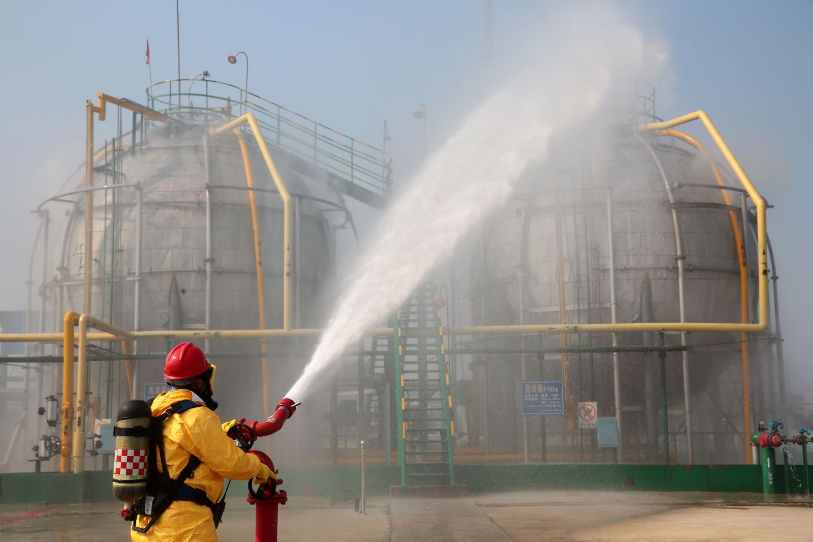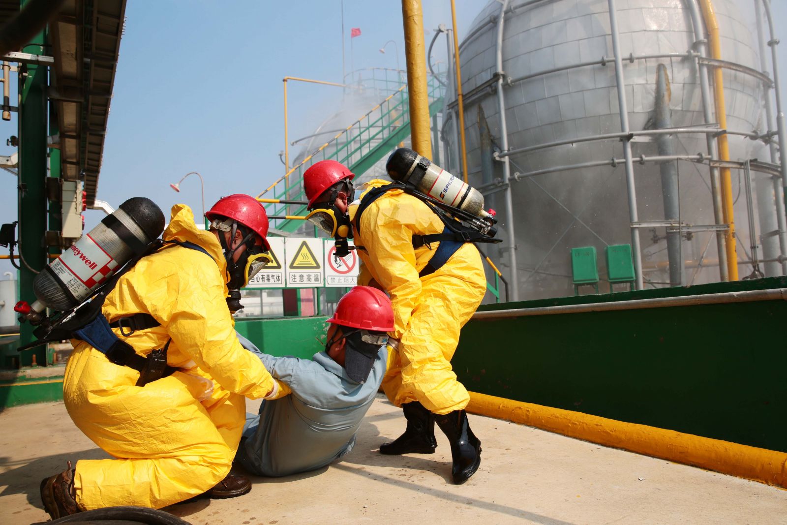 9月5日下午2:30左右,儲(chǔ)運(yùn)車間液氨庫(kù)操作室DCS操作電腦及SIS系統(tǒng)顯示屏上發(fā)出氨氣超標(biāo)報(bào)警聲,當(dāng)班人員通過(guò)操作室視頻監(jiān)控發(fā)現(xiàn)氨球罐B罐底部發(fā)生泄漏,大量氨氣外泄,現(xiàn)場(chǎng)白霧彌漫。兩名當(dāng)班人員穿戴好防護(hù)用品現(xiàn)場(chǎng)檢查發(fā)現(xiàn)氨球罐B罐底部?jī)x表導(dǎo)液管截止閥(二次閥)損壞,且有一人中毒受傷躺在B球罐底部下方的地面上,立即進(jìn)行應(yīng)急處理,并向當(dāng)班值班長(zhǎng)匯報(bào),啟動(dòng)班組應(yīng)急預(yù)案;后車間主任接到報(bào)警,啟動(dòng)車間應(yīng)急程序啟動(dòng);接著公司預(yù)案演練現(xiàn)場(chǎng)應(yīng)急救援指揮部總指揮接到報(bào)警,啟動(dòng)公司級(jí)應(yīng)急預(yù)案,調(diào)動(dòng)各應(yīng)急小組進(jìn)行搶險(xiǎn)救援工作。