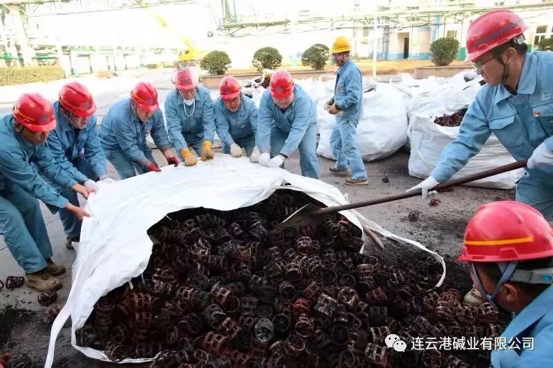 11月7日,重堿車間1#蒸餾塔計(jì)劃檢修,在檢查過程中發(fā)現(xiàn)鮑爾環(huán)被堿渣堵塞嚴(yán)重,影響正常輪換。11月12日,車間將塔內(nèi)舊填料扒出,足足有75立方。考慮到這些填料清理干凈后還有利用價(jià)值,車間牢固樹立“過緊日子”的思想,打算自行組織職工清理。