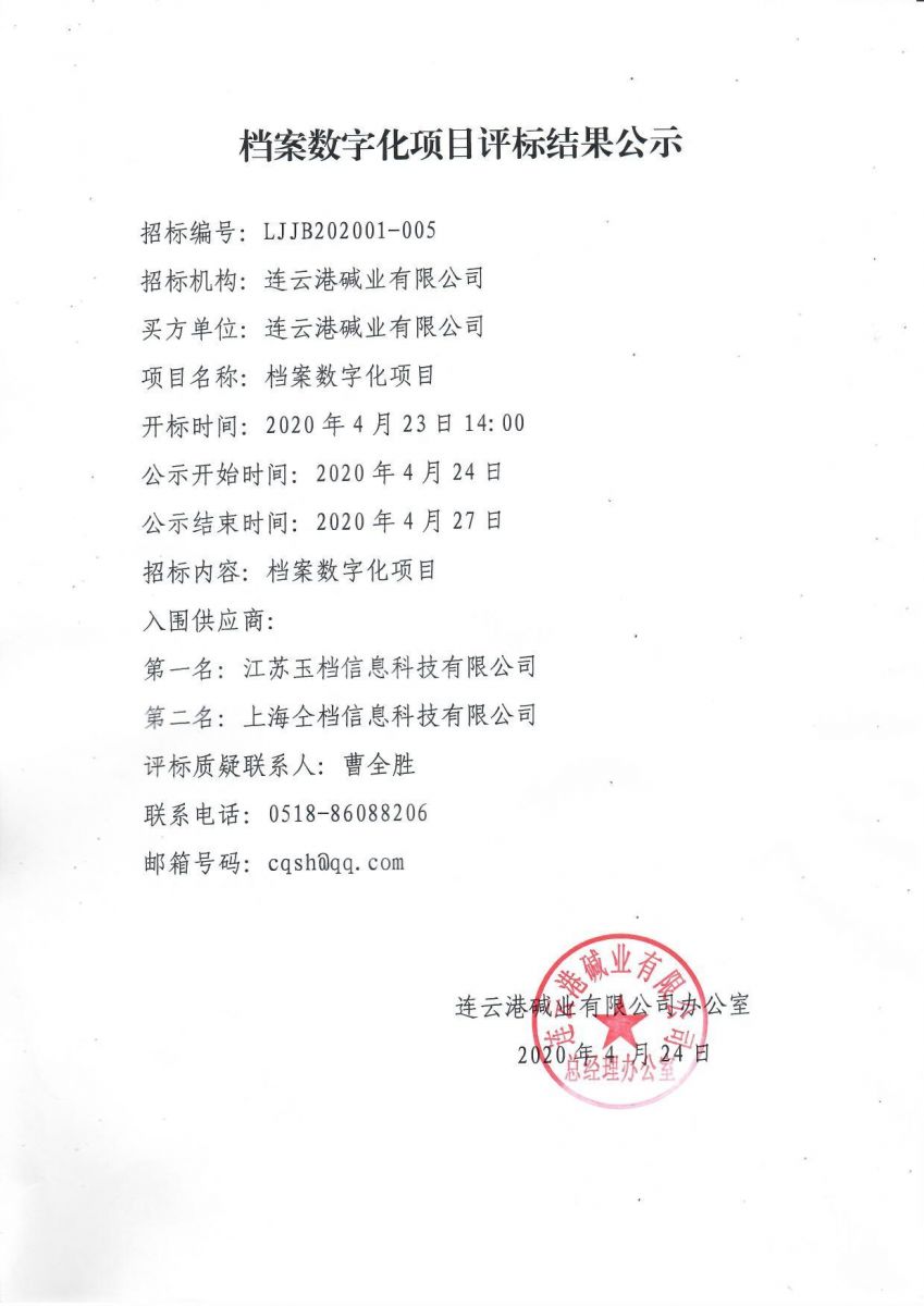 連云港堿業(yè)有限公司檔案數(shù)字化項目評標結(jié)果公示