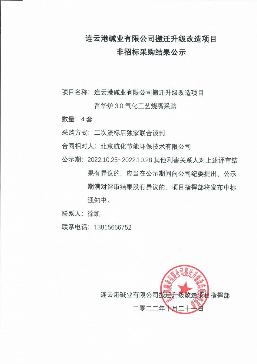 晉華爐3.0氣化工藝燒嘴非招標(biāo)采購(gòu)結(jié)果公示