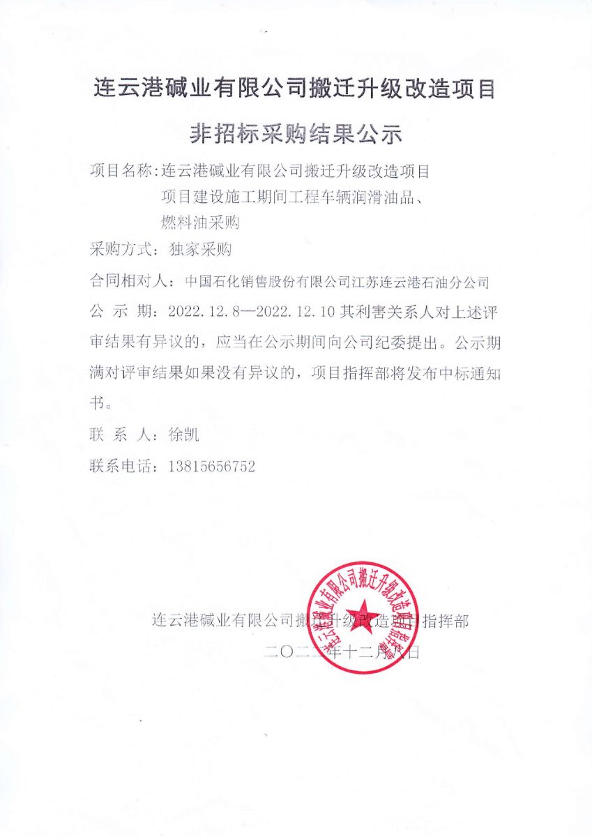 項目建設(shè)施工期間工程車輛潤滑油品、燃料油采購非招標(biāo)采購結(jié)果公示