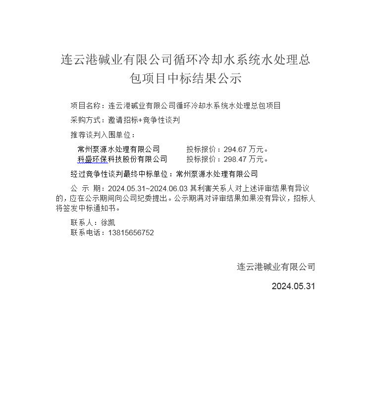 連云港堿業(yè)有限公司循環(huán)冷卻水系統(tǒng)水處理總包項目中標(biāo)結(jié)果公示