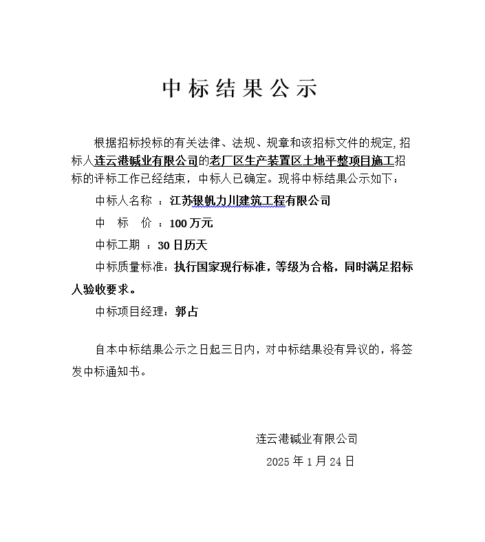老廠區(qū)生產裝置區(qū)土地平整項目施工中標結果公示